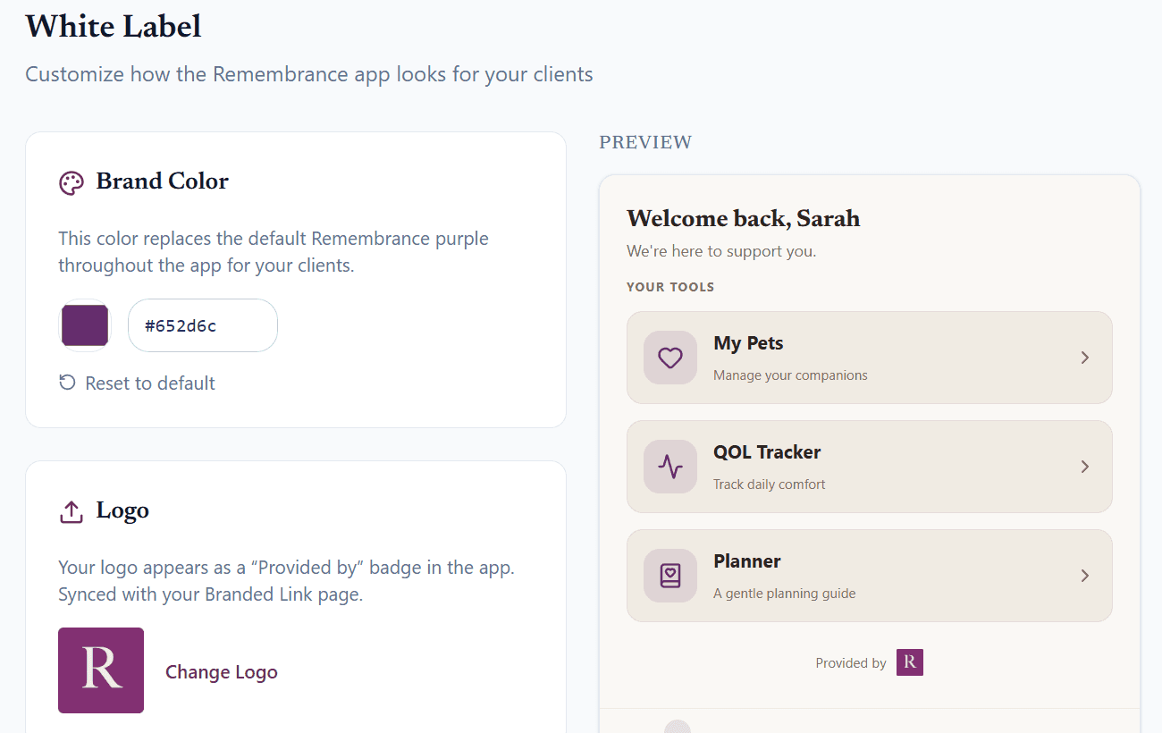Stand out by offering something no other practice does: a complete pet wellness and support platform for your clients. Remembrance helps you build deeper relationships and deliver care that extends beyond the clinic.