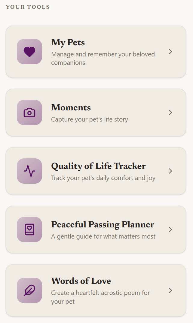 Give your clients free access to My Pets, Quality of Life Tracker, Peaceful Passing Planner, Moments, and Words of Love. These tools help them track their pet's health, capture memories, and prepare for end-of-life decisions with confidence.